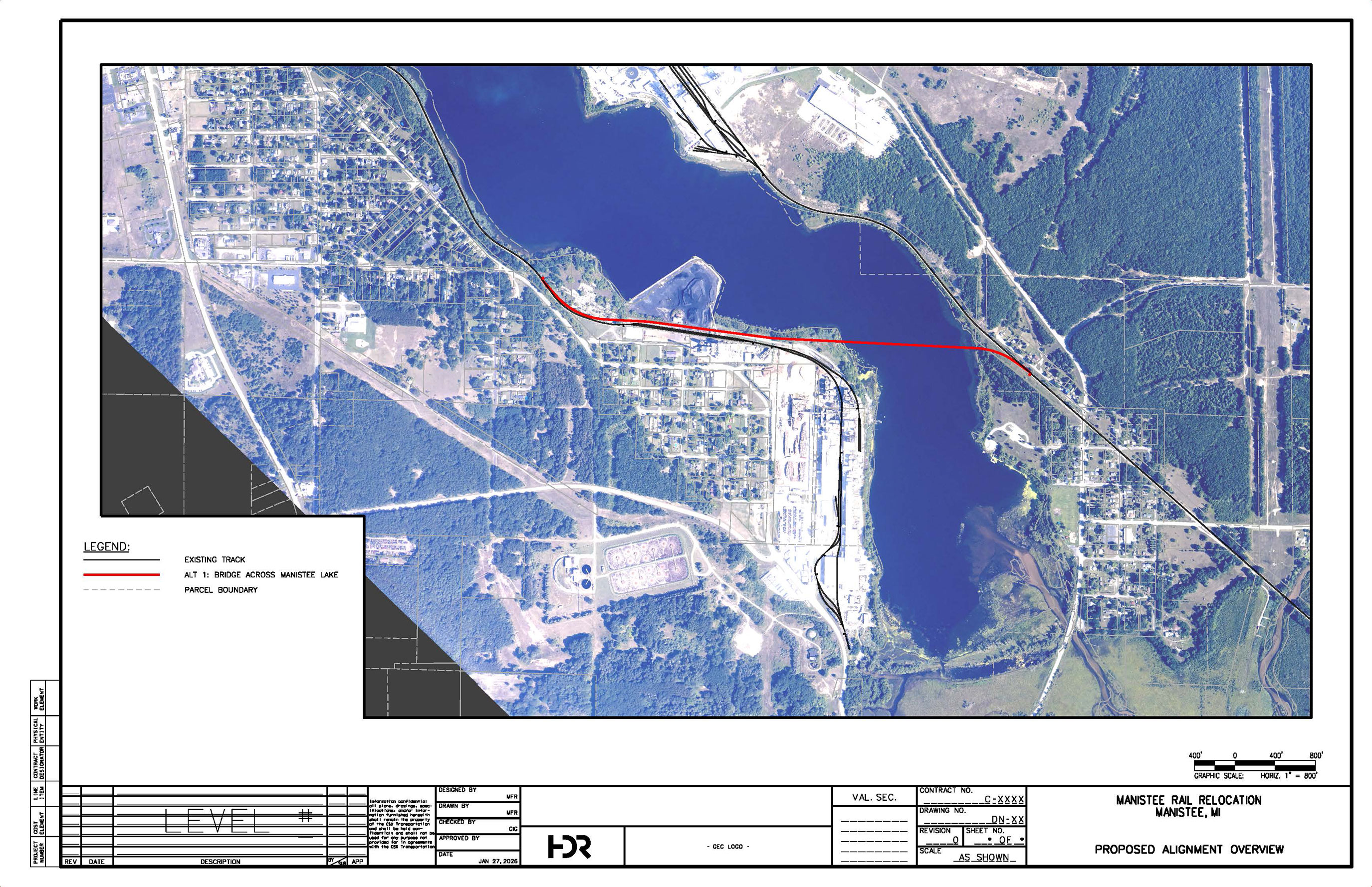 In response to concerns regarding safety, delay, economic development, and freight train rail distance and time, the 2025 Manistee County Safer Southern Rail Route (MCSSRR) Study proposes to construct a new southern rail segment that would result in the elimination of five at-grade crossings, three aging rail-marine bridges, and a rail car staging area on CSX right-of-way. Manistee County studied potential southern rail route alternatives. The Bridge Across the Lake alternative is anticipated to be the least impactful.